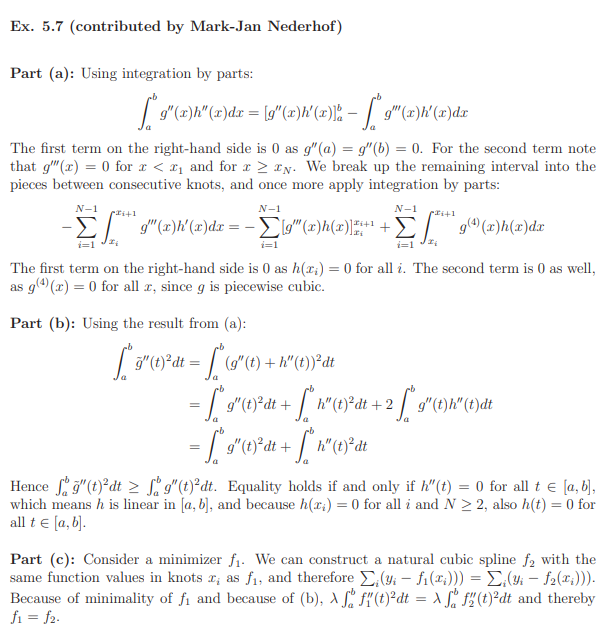 Ex5.7 Derivation of smoothing splines (Green and Silverman, 1994). Suppose that $N \geq 2$, and that $g$ is the natural cubic spline interpolant to the pairs ${x_i,z_i}^N_1$, with $a<x_1<\cdots<x_N<b$. This is a natural spline with a knot at every $x_i$; being an N-dimensional space of functions, we can determine the coefficients such that it interpolates the sequence $z_i$exactly. Let $\tilde{g}$ be any other differentiable function on $[a,b]$ that interpolates the N pairs.