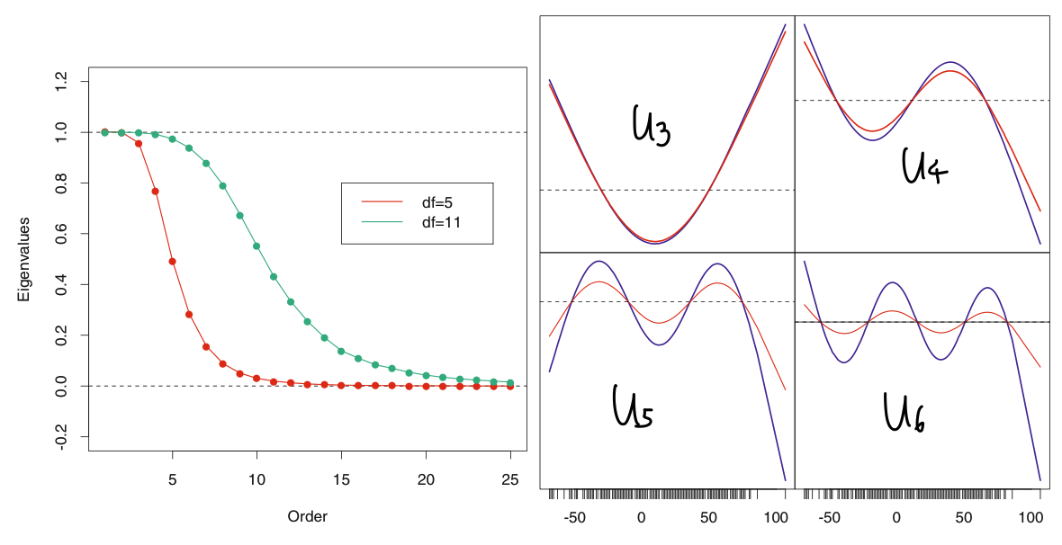 붉은 선은 5개의 변수를, 초록 선은 11개의 변수를 $df_\lambda$로 잡은 경우이다. 각 고유벡터에 해당하는 고유값은 특정 고유벡터의 크기를 나타내는 것이고 여기서 고유값이 작은 고유벡터는 무시하는 것이다. 우측 하단의 경우에는 각 데이터 포인트에 해당하는 고유벡터의 값을 나타낸 것이다.