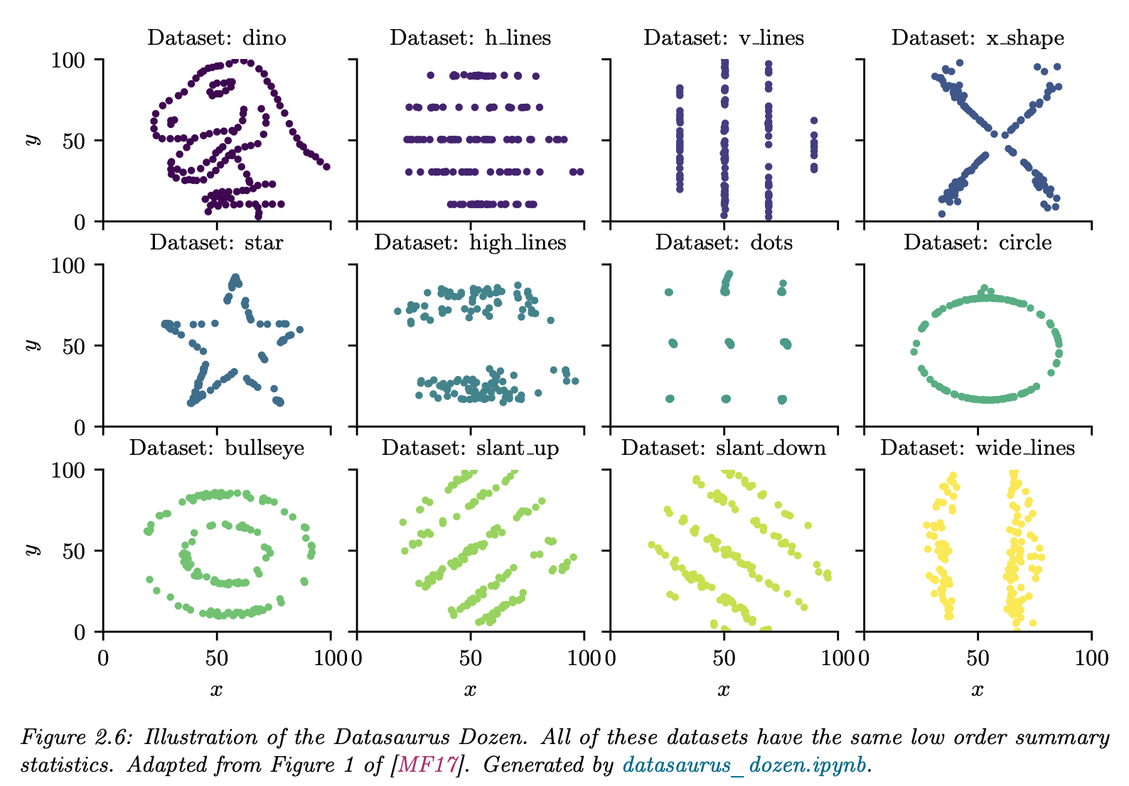 그렇지만 위 그림처럼 요약 통계량만 믿다가는 큰 코 다칠 수도 있다. 같은 요약통계량을 가지더라도 위와 같이 전혀 다른 데이터의 흐름 혹은 두 데이터의 관계를 설명하는 경우가 있기 때문이다. 1차원 데이터의 경우에는 아래처럼 박스플랏 대신 분포를 육안으로 설명해주는 바이올린플랏으로 데이터를 시각화하여 문제를 해결할 수도 있다.