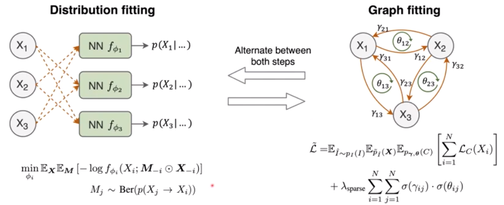 At distribution fitting, it learns multiple conditional sets with drop-out from observational data. The bernollui parameter $p(X_j \rightarrow X_i)$ is updated at Graph fitting