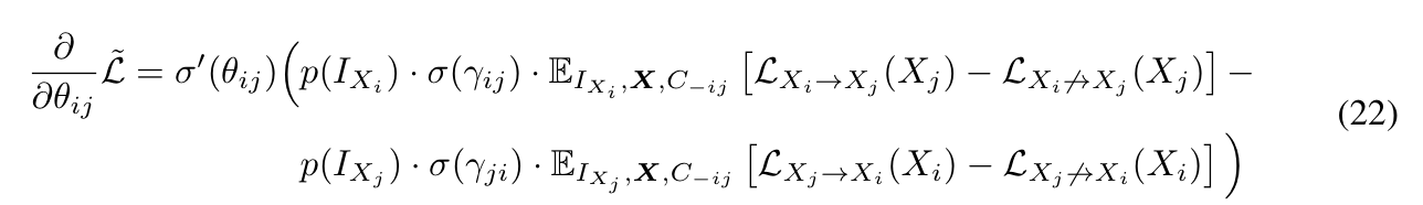 $$\dfrac{\partial}{\partial \gamma_{ij}} \tilde{\mathcal{L}} = \sigma(\gamma_{ij}) \cdot (1-\sigma(\gamma_{ij}))\cdot \sigma(\theta_{ij}) \cdot \mathbb{E}_{X,C_{-ij}}[ \mathcal{L}_{X_i \rightarrow X_j} (X_j) - \mathcal{L}_{X_i \nrightarrow X_j} (X_j) + \lambda_{sparse} ] $$