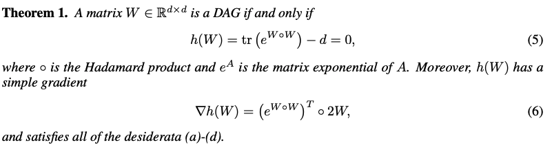 - NOTEARS: $ h(W) = tr(e^{W\cdot W}) = 0$ (W is an adjacency matrix) (slow, param-sensitive)