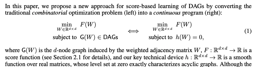 - Restrict the search space to acyclic graphs: Originally with lagrangian, regularizer which have cons like local optima problem and it can not scale over 100 variables