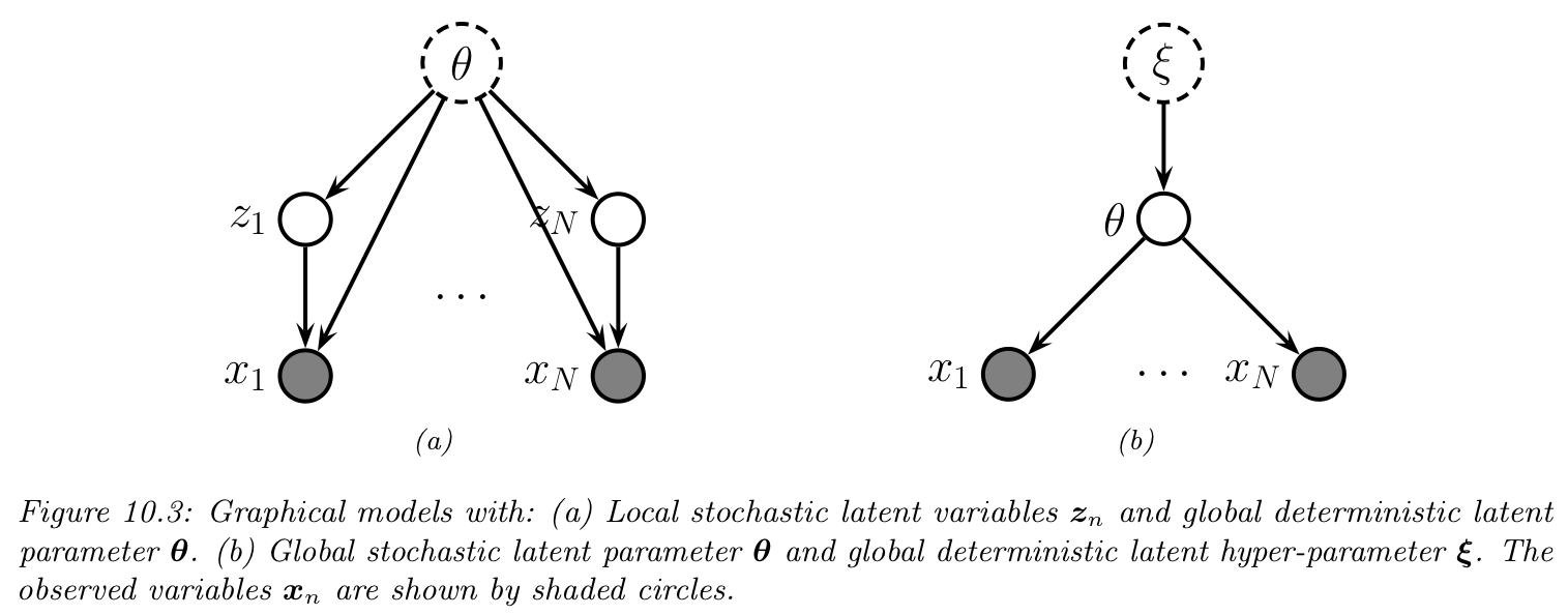 위 구조에서 local latent variables $z_n$가 hidden이므로 우리가 $p(\theta|\mathcal{D}$를 구할 때는 marginze out(적분으로 해당변수 없애주기) 해주어야 한다. 즉 다음과 같이 local log marginal likelihood를 구해야한다.